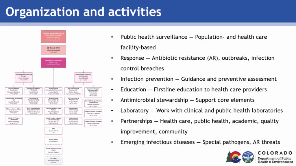 CDPHE introduced the HAI/AR program led by Dr. Chris Czar MD.
